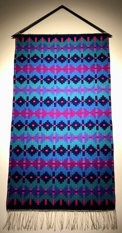 Visitors love the “Shetland knitting theme” tea towels that I weave. The colourful Shetland wool wall hangings & rugs are also very popular.
