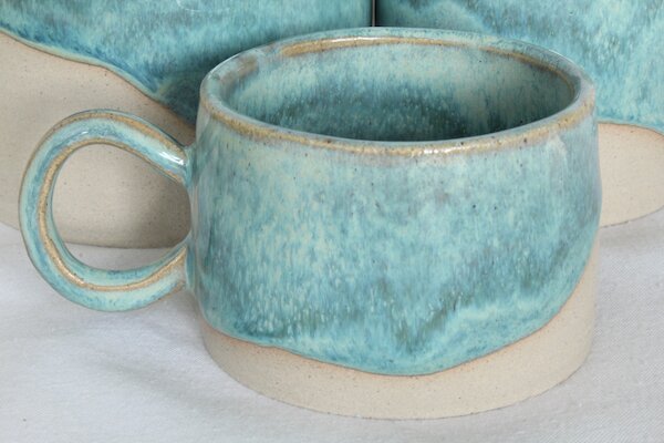 I allow myself to be very free flowing in my creativity, I feel it is something that I cannot force upon myself. When creating pieces, I will focus on one form - such as a mug - I will make a range of sizes, in the next day or two (once dried out to the correct consistency) the wheel-thrown cylinders will be taken to the wheel once again to trim off excess clay, to lighten and refine the piece, I then attach a handle, either a straight or more rounded handle depending on what I feel to be fitting for the shape and size of the mug. The most time consuming part of the process is without a doubt the glazing stage, the Löragub collection which has a total of 9 layers of glaze. I apply my glaze with a hake brush, I do find this to be a very therapeutic stage and will often listen to music or a podcast to keep my mind busy - as the glazing stage can become a little repetitive.