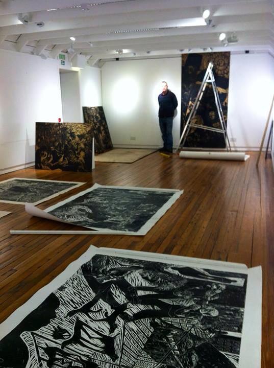 Paul is well known for his prolific output and mastery of many media, but it is arguably his woodcuts which are the most powerful, expressive, bold and unflinching. This exhibition aims to represent the process of Paul’s methods, and the strong illustrative quality of his work. Jane Matthews, of Shetland Arts, explains: “Choosing from Paul’s incredible stock of work from over 20 years has been a privilege. We were keen to look at his work from a different angle and focus particularly on the processes involved in making his work. So, for example, we have his original hand-cut wooden blocks that add to the power of the final works.”Downstairs in the lower gallery are exhibited iPad prints, Paul’s most recent passion. Working on either an iPad or IPhone, it is a transportable medium far removed from the slow and labour intense woodcut, that lends itself to a quick, colourful and fluid results. The compilation of animations projected in the stairwell demonstrates Paul’s technique and the process of drawing, over-drawing and reworking until the point of completion.
