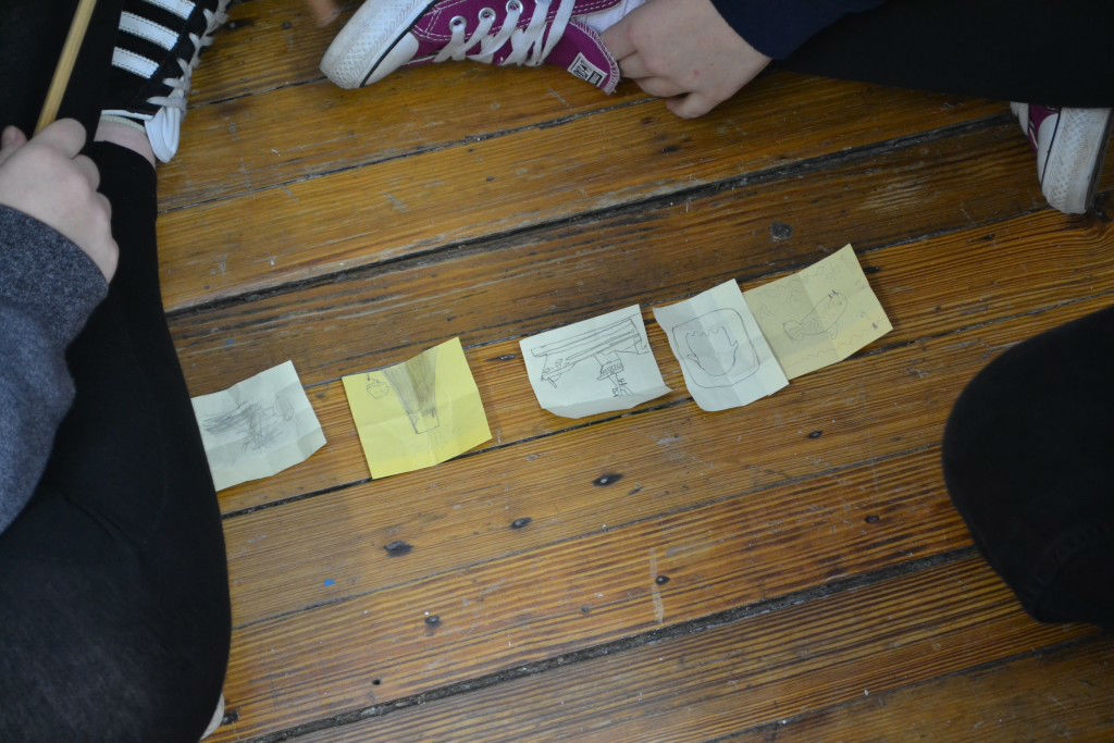 Groups of 4-5, sat in a circles. I distributed the drawings back out again. The aim of the game is to make up a story using the random drawings you get – even if you don’t know what the drawing is of – just make it up. Line up the drawings and create a narrative. In other words – read the drawings.
