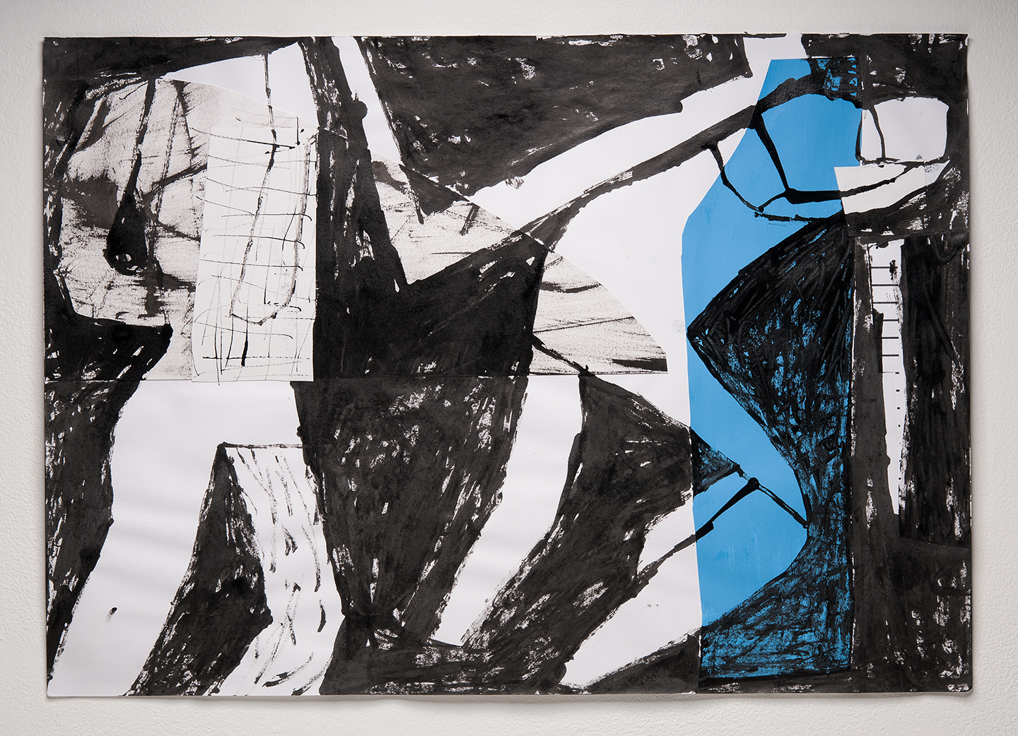 The artist Fraser Taylor, who conceived the exhibition, spent several months in the Booth at Scalloway between 2013 and 2014 as part of a sabbatical from his position as Adjunct Professor at the School of the Art Institute of Chicago. Whilst in Shetland he found himself inspired by the largely treeless landscape, the shapes of the myriad small islands, black rock strata, and the shifting colours and light. These experiences informed his drawings which are on display in the lower gallery at Bonhoga, whilst the main space upstairs is showing a series of suspended textile works which form a response to the ‘Shadowed Valley’.