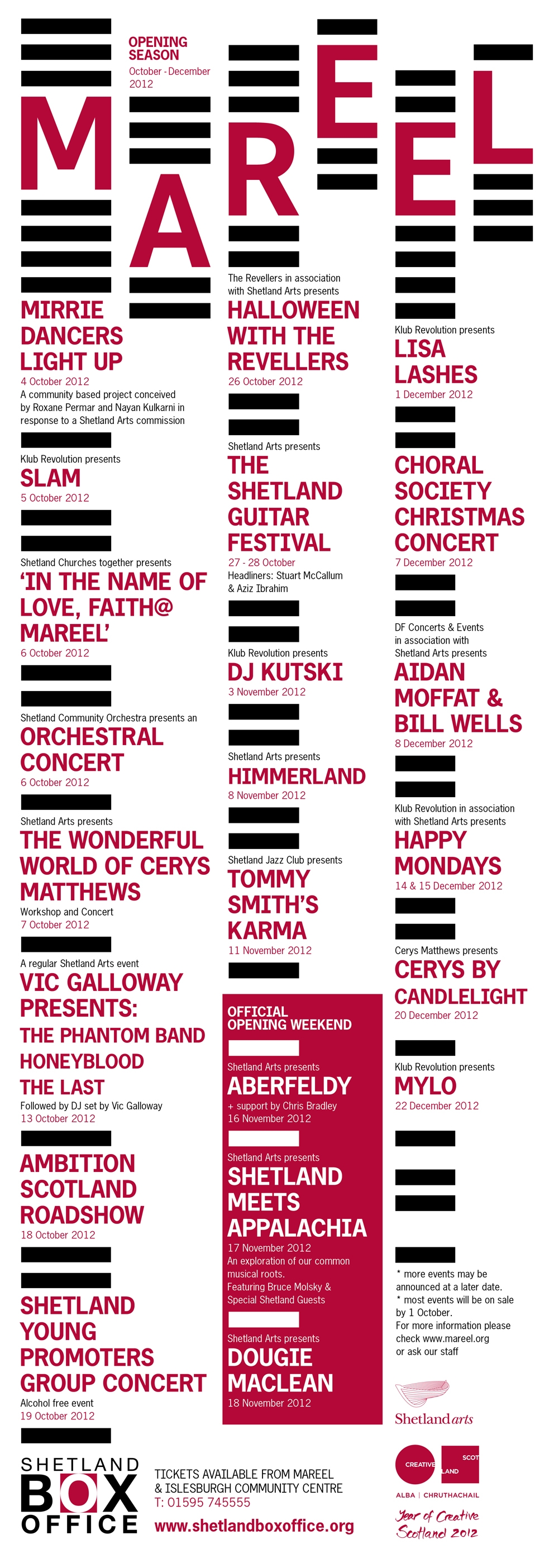 Official Opening Season at Mareel runs from October to December 2012. More events may be announced at a later date. Tickets for most events will go on sale Monday 1 October.