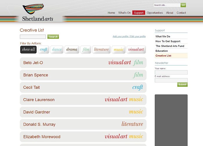 The List is divided by art form: craft, dance, drama, film, literature, music, and visual art, and when users make a profile they select the most suitable art form(s) to represent their work. The list has been divided in this way because Shetland Arts delivers arts development across these arts forms through a dedicated team of specialist officers, who can provide support to creative people working in each art form.