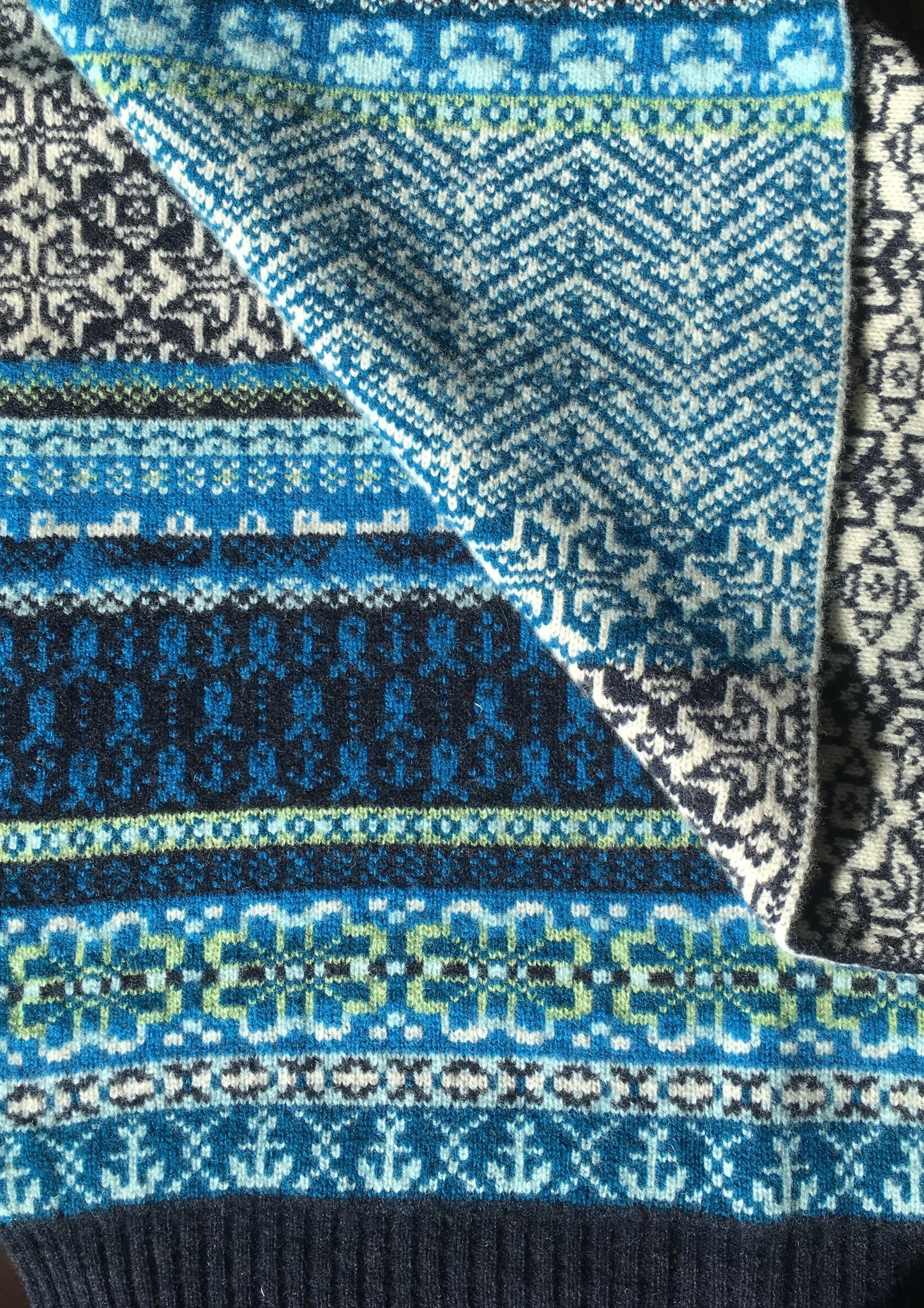 I learnt to knit when I was peerie but it wasn’t until I tried machine knitting during my last year of school that it really captured my interest. I like the mechanical side of the machines themselves and figuring out how to come up with interesting fabrics. I worked at the Shetland Woollen Co. for a couple of years (which is the Scalloway museum now). They sent high quality knitwear to customers all over the world. I helped operate the power frame machines, mainly threading up the cones of yarn, changing the odd broken needle and checking the pieces as they came off and mending any dropped stitches; I’m an excellent fixer of holes thanks to working there, which is always handy!