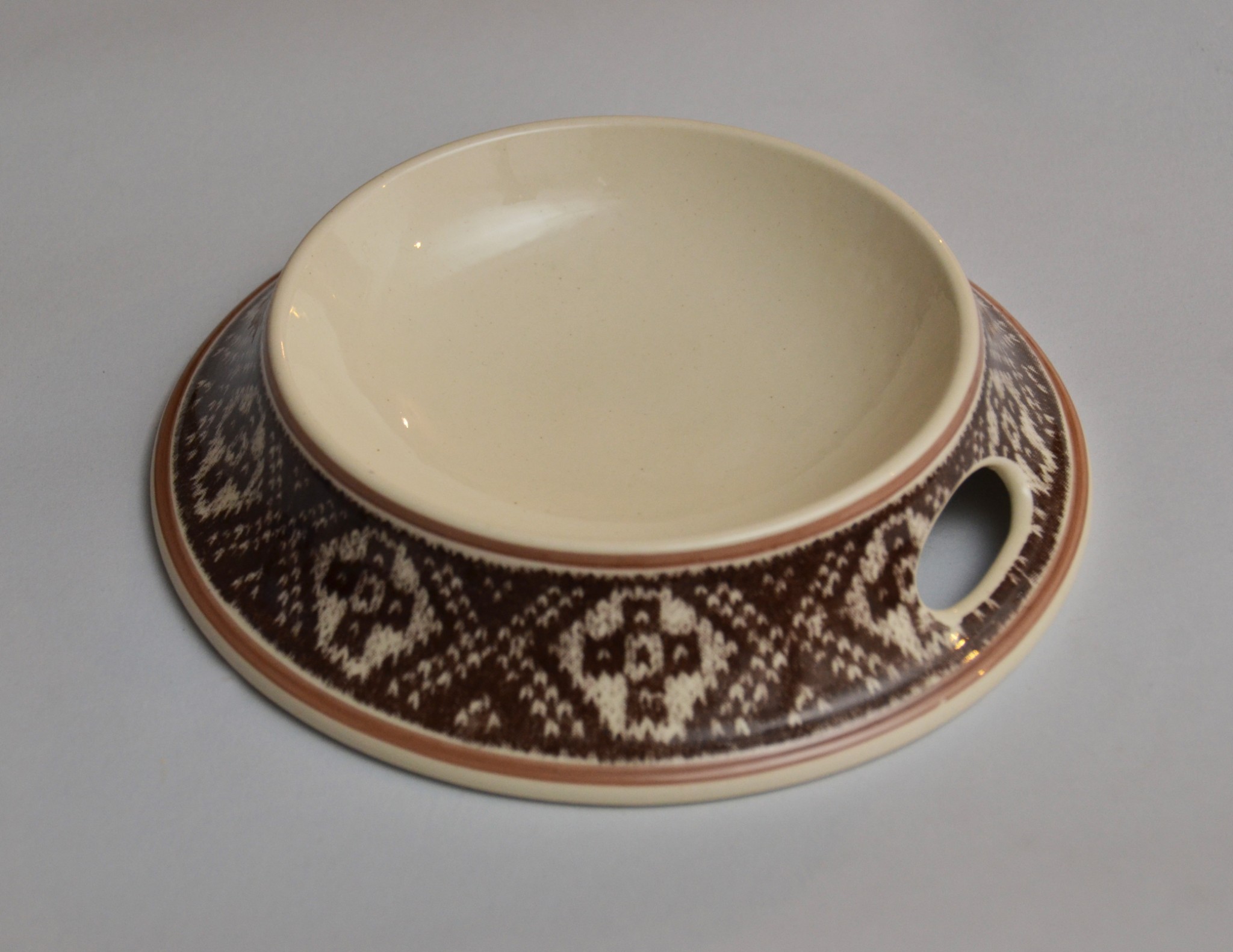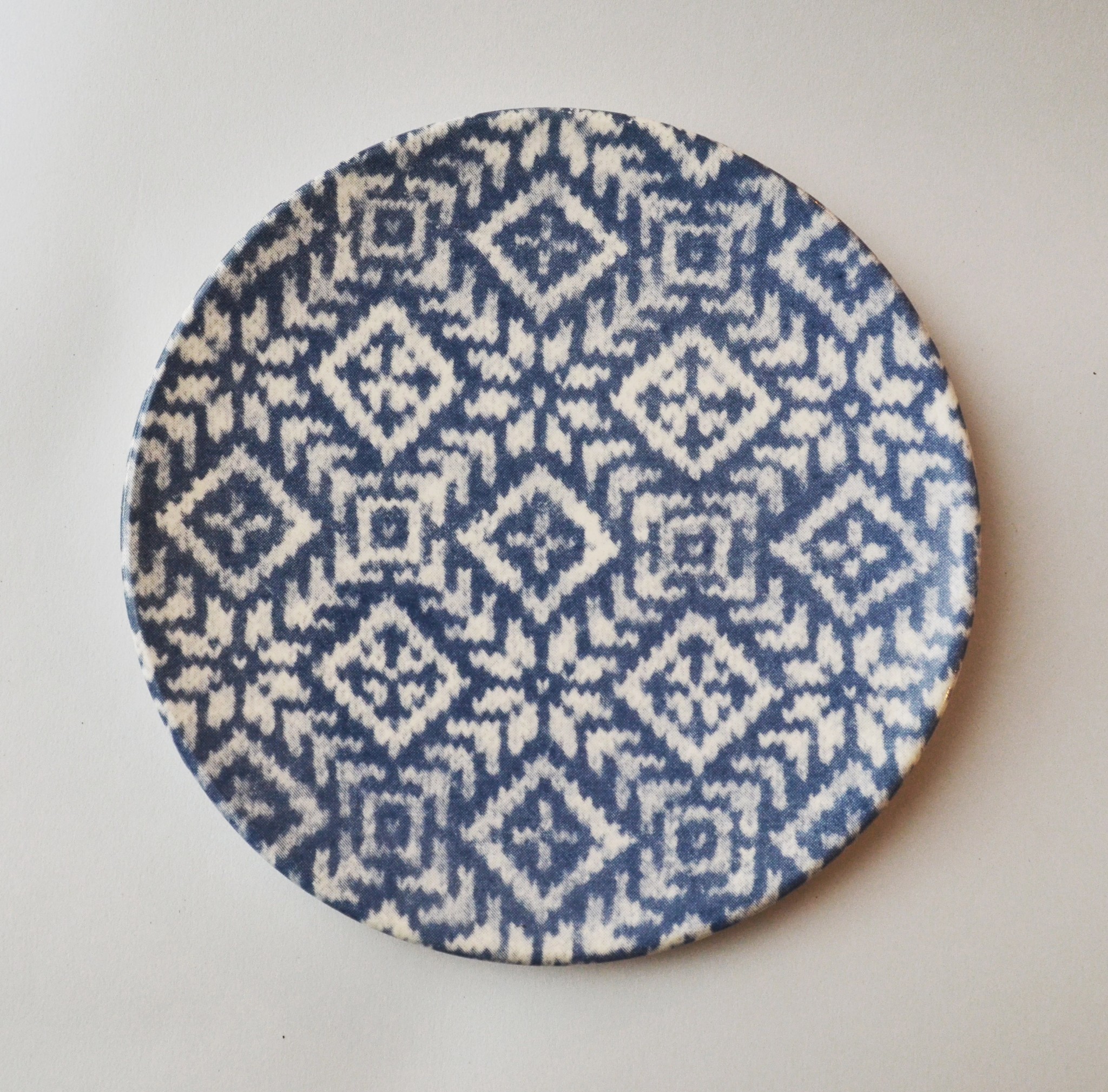 It's important to me to 'locate' my work, to make things that belong in some way to place, culture or environment. We are lucky enough to have a rich textile tradition and I wanted to find a way of adapting knitted patterns to ceramic forms. This is not entirely straightforward – the patterns have developed over many years to follow the forms of bodies and garments and so don't always adapt comfortably to tableware shapes. The challenge (and the fascination) is in translating patterns into a ceramic 'language' – finding patterns that can be modified to fit happily into plate shapes, for example, and to work well using ceramic colours such as the classic blue and white combination.