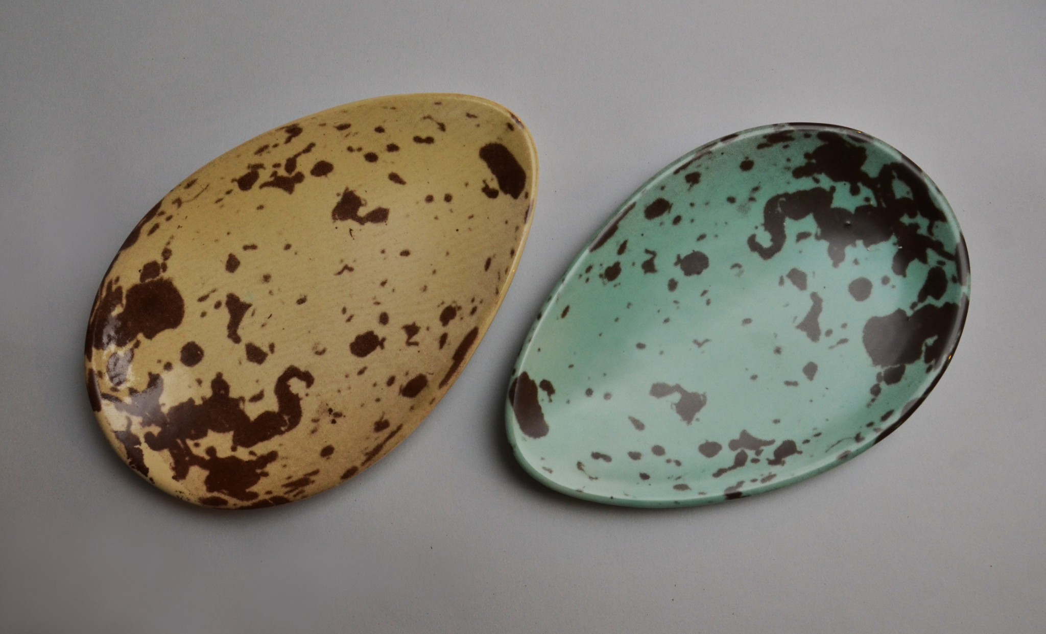 These plates are based on guillemot eggs – highly distinctive, large relative to the size of the bird itself, elongated and slightly pointed. Their natural colour is quite varied, but most often a bright, greenish, turquoise blue with a dark speckle. As well as all the symbolic connections of the egg in general these particular eggs seem to be a symbol of the natural world of the North Atlantic - a symbol that we almost seem to have inherited an ability to recognise.