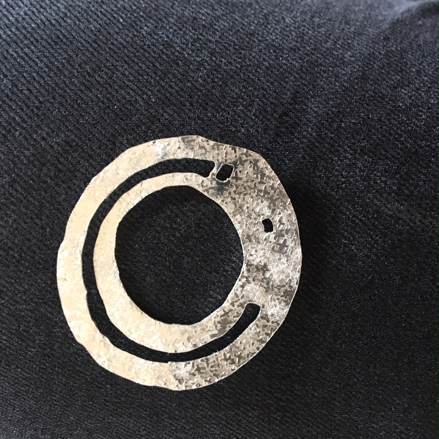 The Tree of Life necklace shown is an enlarged symbol hand pierced from sterling silver. It has been embossed with pieces from the hand knitted lace silver wire shawl that I inserted into a crofthouse window as part of my Hentilagets Installation. This installation included wire lace knitted inserts set into the fence surrounding the crofthouse. This was done to honour the knitters of the past who simultaneously ran the crofts while knitting. Many of the lace knit patterns have names associated with crofting and I chose those for my lace fence parts. The Lace shawl featured patterns associated with the domestic environment so I chose the Braand Iron edge (a brand iron was used for cooking on), a Tree ofLlife border and a Candlelight middle. The installation was completed in November. There followed a very stormy few weeks and by the time the storm passed enough to enable me to retrieve the shawl, I found it blown to pieces and thrown down the field by the wind. I’ve found a way to preserve it is to emboss it into sheet silver and use that to create jewellery. The endless (re)cycle of life!