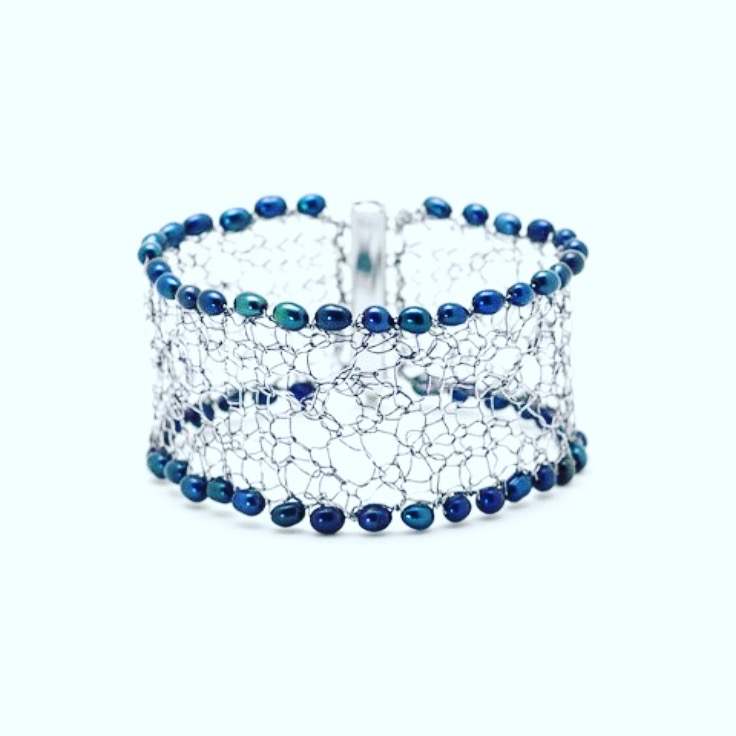 The cuff bracelets are designed to be worn on special occasions and my aim for them was to recreate the Shetland Lace patterns in precious metal so that the patterns could really be treasured as I believe they should. The cuffs are great for brides and can be made to match bridal parties. Each cuff is made using fine silver wire, colored enamel wire and has a sterling silver fastening.