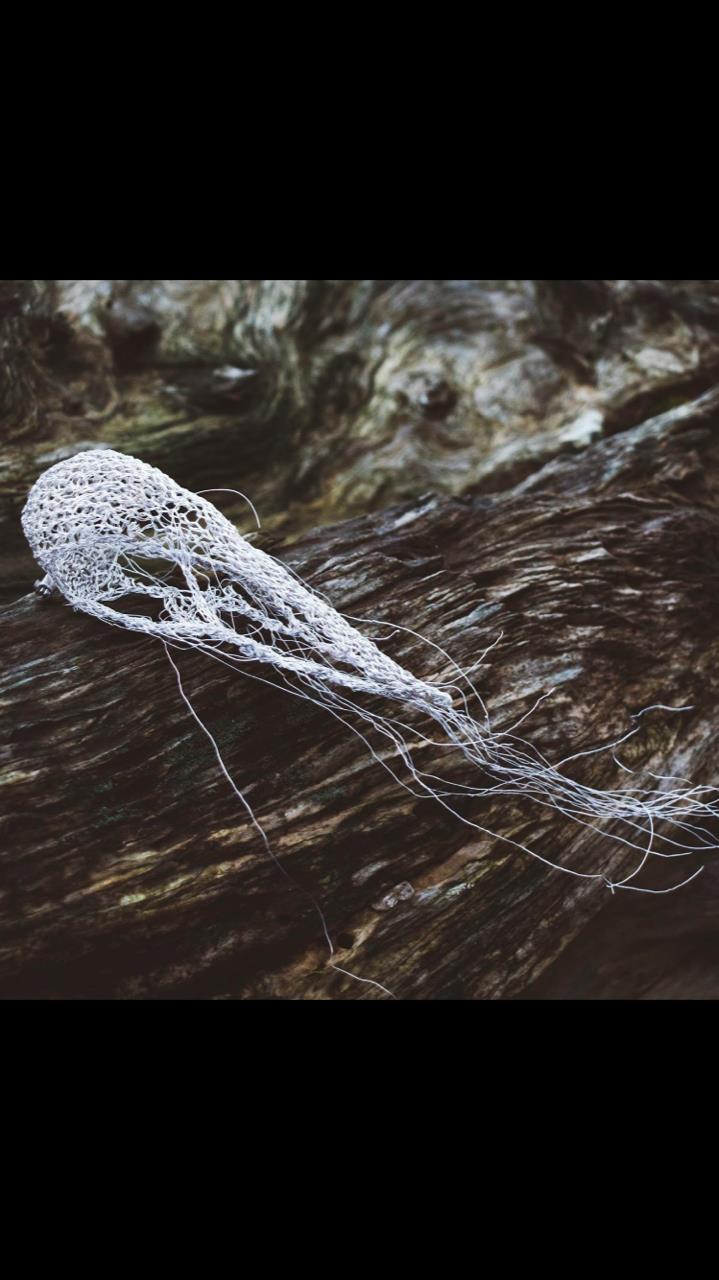 The skull is a development from Crang and develops the theme of mortality and immortality. It is knitted in fine silver wire and can be displayed as a beach find or worn as a brooch.