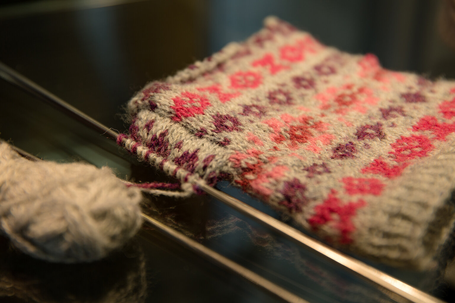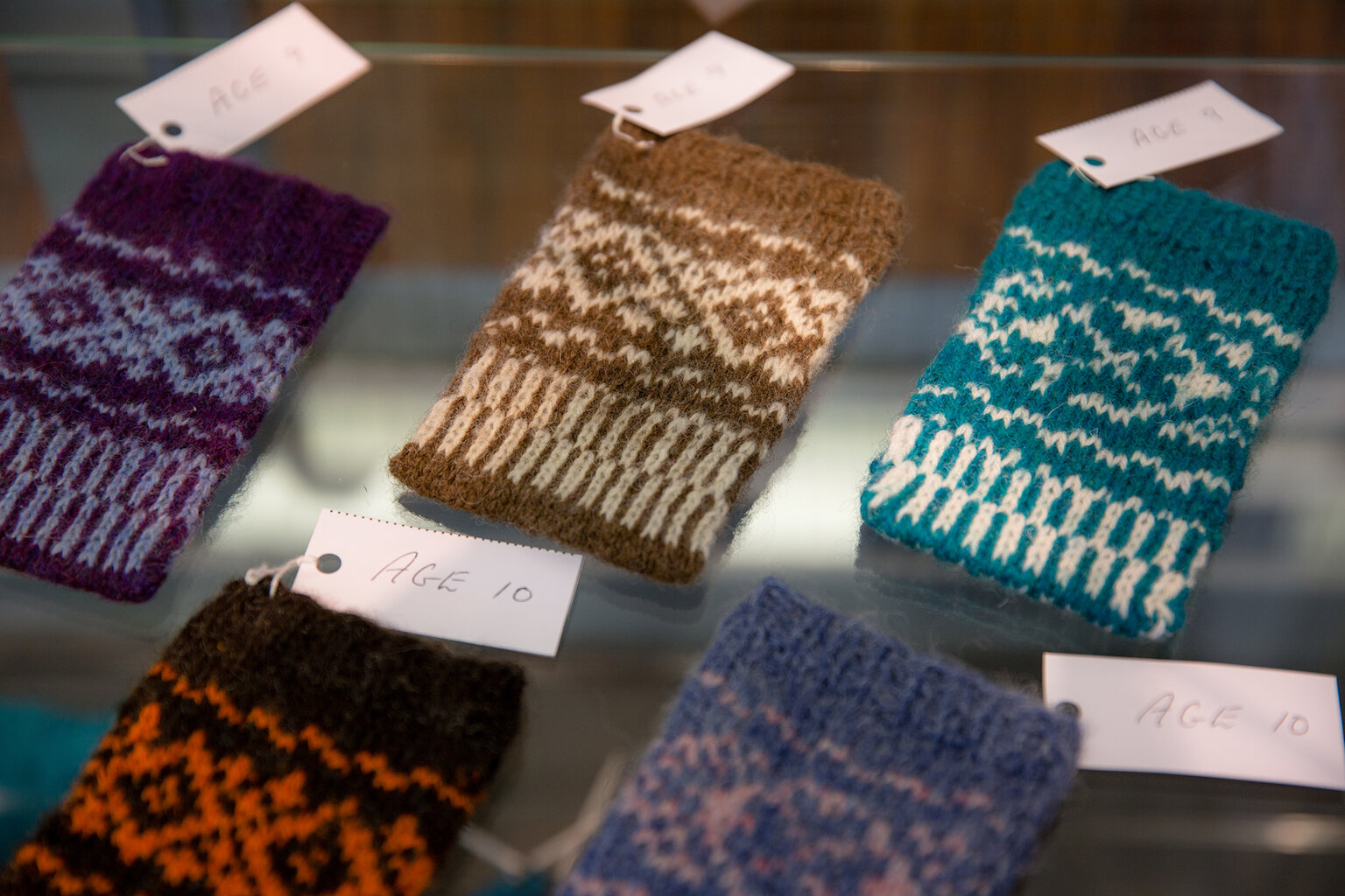 Through the tutor led sessions, the PeerieMakkers learn Shetland knitting techniques using Shetland yarns. The small group sessions are delivered in a fun, child-centred way, encouraging expression and individuality in each piece of knitting produced. The pieces exhibited at Bonhoga are a sample of the many wonderful pieces created by the children, they show achievement by age, and are a combination of finished pieces and work in progress.