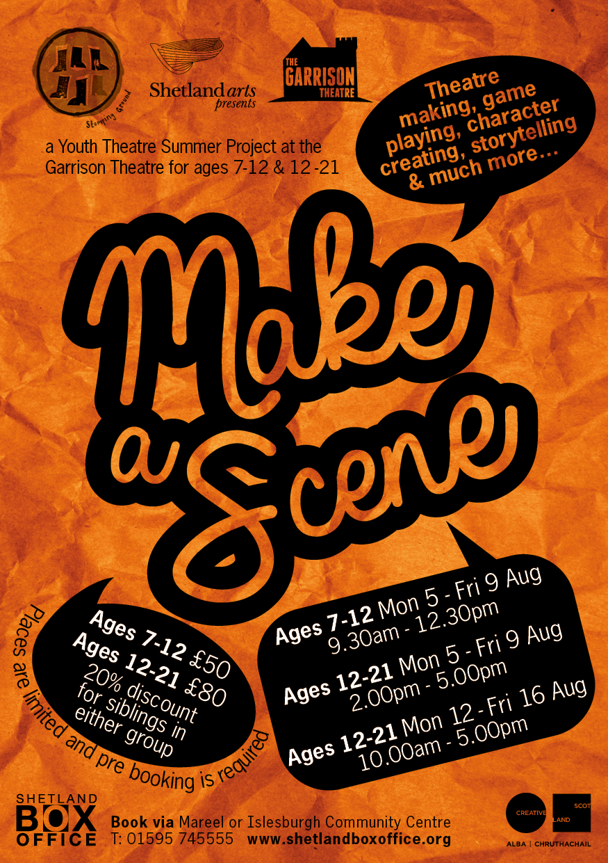 Shetland Youth Theatre in partnership with Stomping Ground present Make a Scene - a Youth Theatre Summer Project for two age groups (7-12 and 12-21).