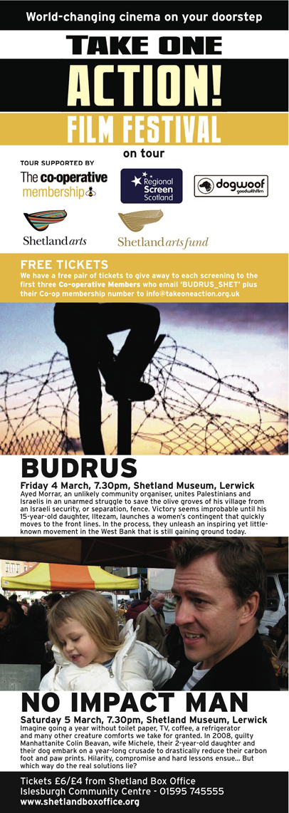 In support of Take One Action, Shetland Film Club and Shetland Arts will host a screening Budrus at the Shetland Museum and Archives on Friday 4th March at 7.30pm, and No Impact Man on Saturday 5th March at 7.30pm.