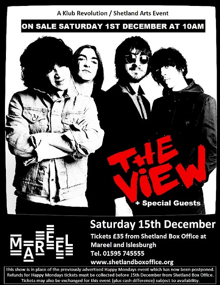 Klub Revolution and Shetland Arts are absolutely delighted to announce that The View have agreed to step in at short notice to replace the Happy Mondays as headliners for our event at Mareel on Saturday 15th December.