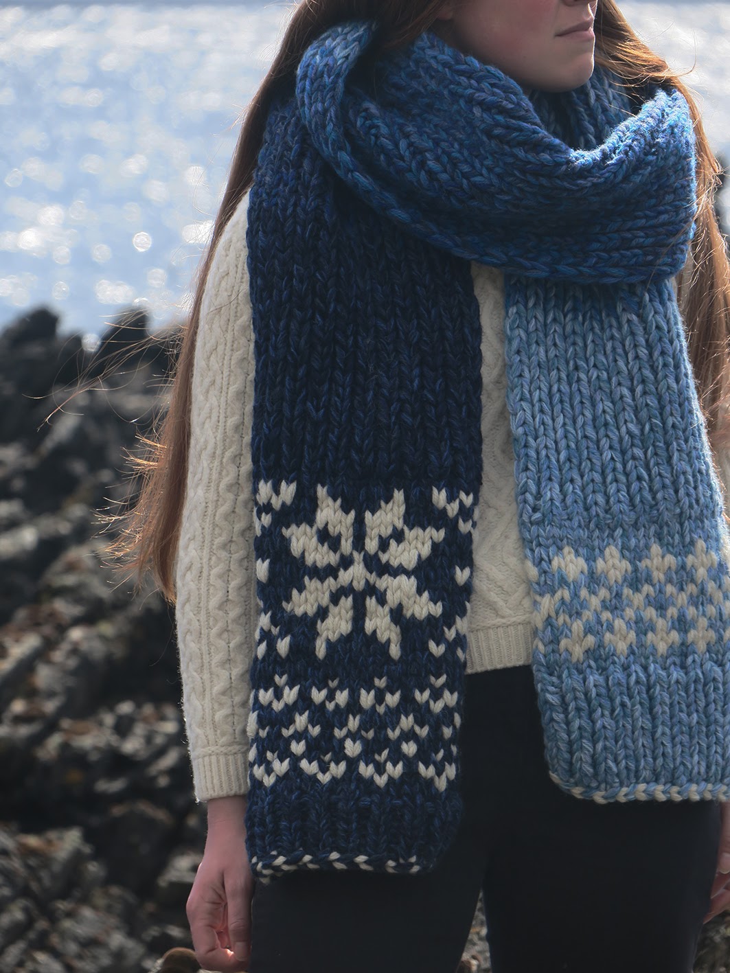 I wanted to use a limited pallet but with a multitude of shades. I love Jamiesons of Shetland wool for several reasons, it is produced and spun in Shetland and it comes in a truly impressive range of colours. It’s a dream for a knitwear designer passionate about shades - the dyes reflect very well the shades of the Shetland landscape. Their range of Blues are particularly beautiful - between sea and sky you get a multitude of tones – and their shades of blues were the obvious choice for the project.