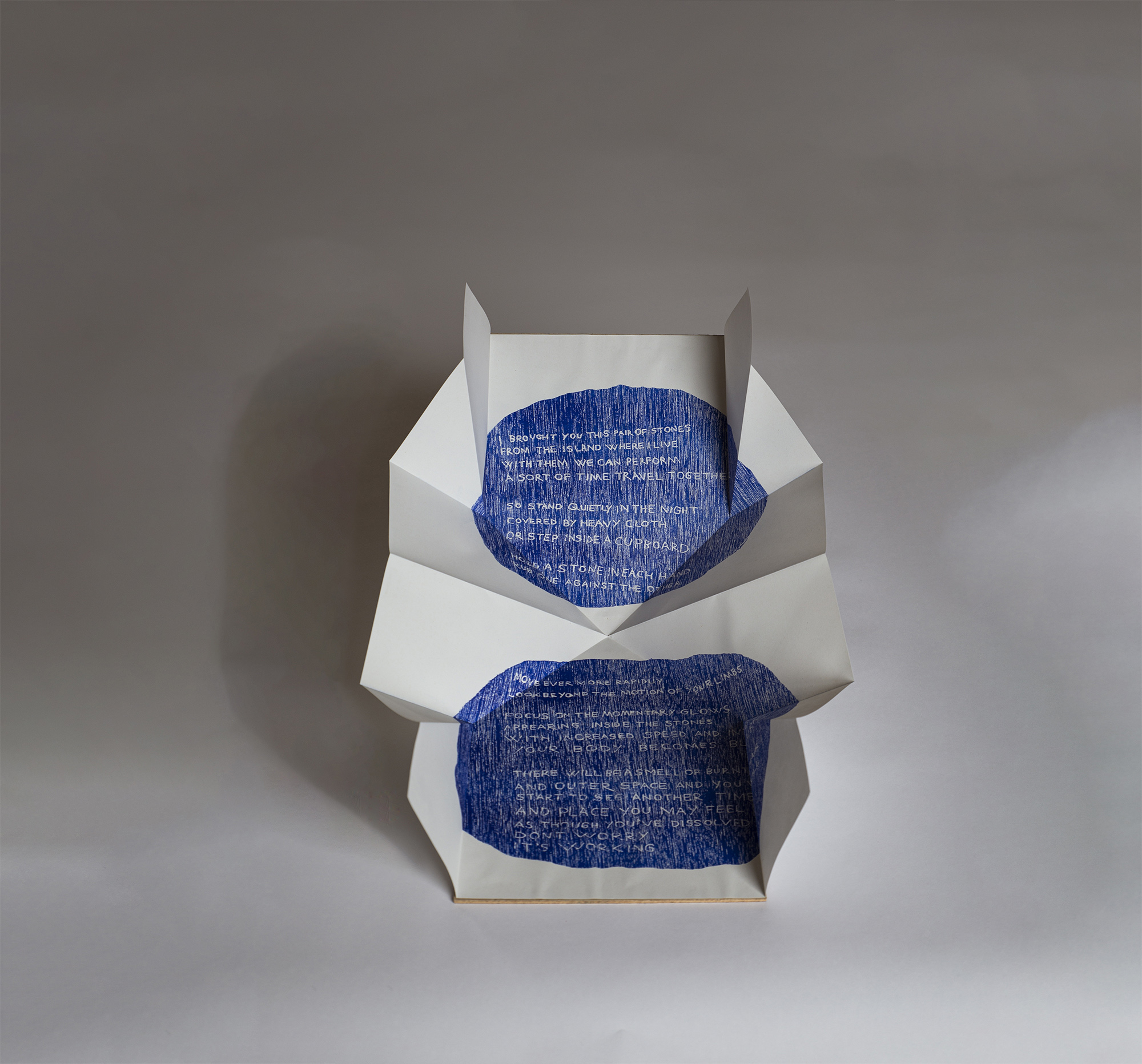 Since moving to West Burra, I’ve found myself pulled towards special spots in the landscape, where prominent veins of quartz run through the black rock like rips in the fabric of time. Instructions for Time Travel with West Burra Quartz began life a short text I wrote whilst thinking about two specific pieces of quartz I’ve owned since age 6. There has been many times throughout the years where I’ve been exploring dark spaces (my primary school stationary cupboard or 50 metres down the bottom of an ancient ochre mine in the Mendips) and found myself rubbing the quartz pieces together to activate their triboluminescent glow. A beacon in some moment of dark. The accumulation of these memories are like a window back through time for me, and through this work I was thinking about how to create a similar window to move forward in time. Past any difficulties, into a future. Making multiple copies of this work to disperse across the world made particular sense. Who wouldn’t want a way to travel back or forward in time?