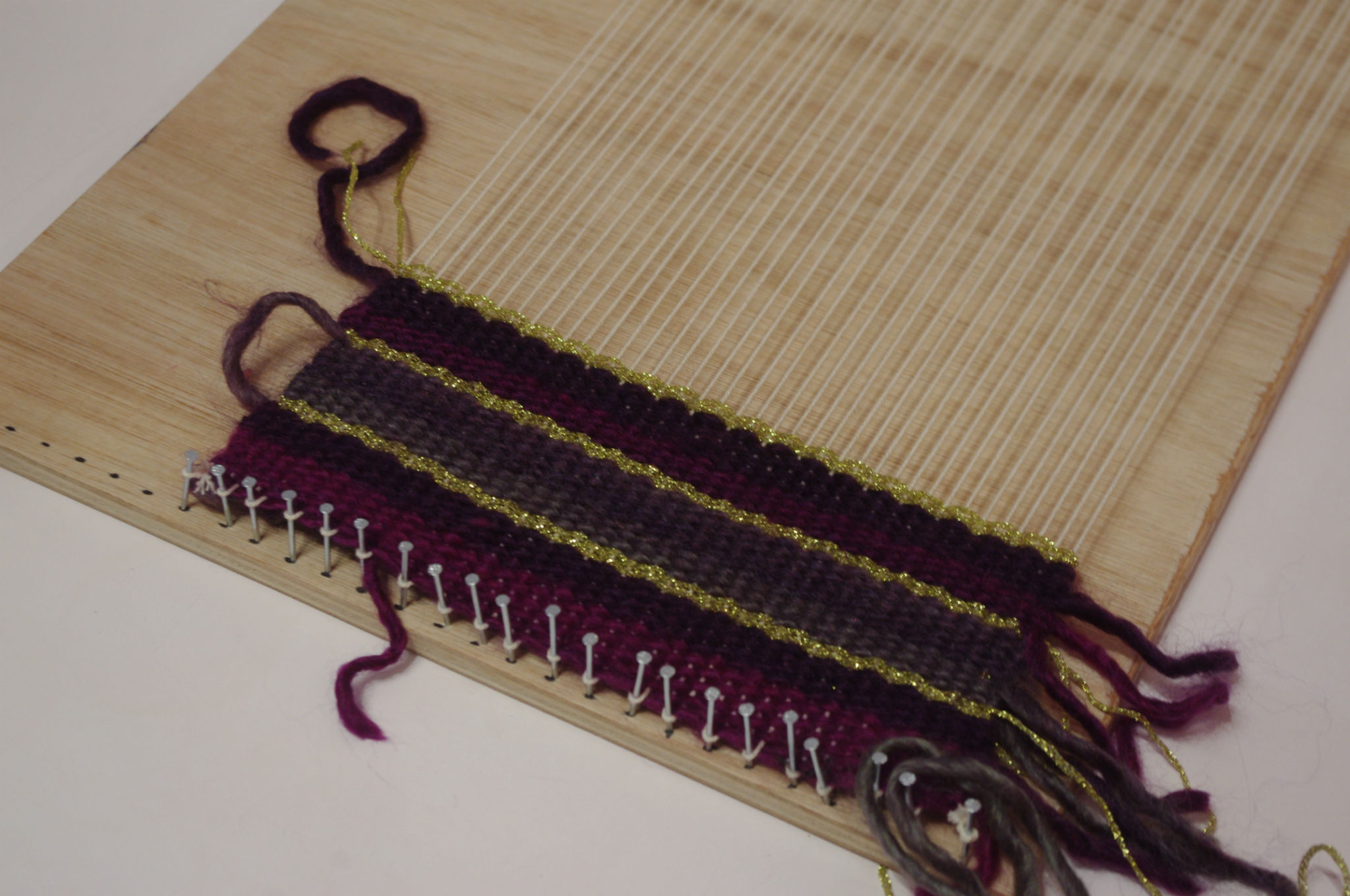 At the start of the next session it was time to make the looms. We used a simple technique that anyone can do at home, setting pins equally in place at the top and bottom of a wooden board all ready to warp up. Then the fun part of starting to weave could begin! The participants chose beautiful colour combinations and experimented with various weaving techniques. As the sessions went on, everyone grew in confidence and ability. If any errors were made whilst weaving everyone was able to quickly spot and correct them, which showed a real understanding of the process.