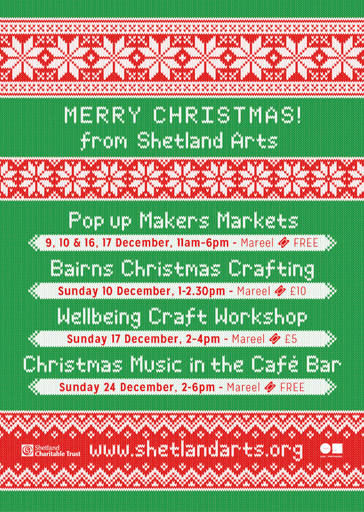 On Christmas Eve, there will be a music extravaganza in the Mareel café bar. Starting at 2 o’clock with Wellbeing Choir leader Suzanne Briggs at the helm, a Christmas Carol session will run for an hour. Wouldn’t be Christmas without it! The singer-songwriter Adam Guest will take over from there with some guitar-driven tunes. A festive themed Open Mic coordinated by our own Magnus Stout will close out the Christmas Eve fun.