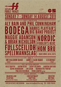 Fiddle Frenzy, Sunday 7th to Sunday 14th August, is a summer school and cultural festival that concentrates on Shetland's unique sense of place, and is designed to teach and pass on traditional Shetland musical styles and tunes. As well as fiddle tuition, Shetland style guitar accompaniment is offered, and classes are available in Traditional Shetland Knitting techniques, Creative Writing and Art Workshops that will feature our spectacular land and seascapes. The music tutors include some of Shetland's most proficient musicians including Ross Couper, Bryan Gear, Cathy Geldard, Andrew Gifford, Kevin Henderson, Jim Leask, Bernadette Porter and Pauleen Wiseman, who will pass on their skills, knowledge and enthusiasm. The fantastic Ryan Couper will once again lead the guitar classes.