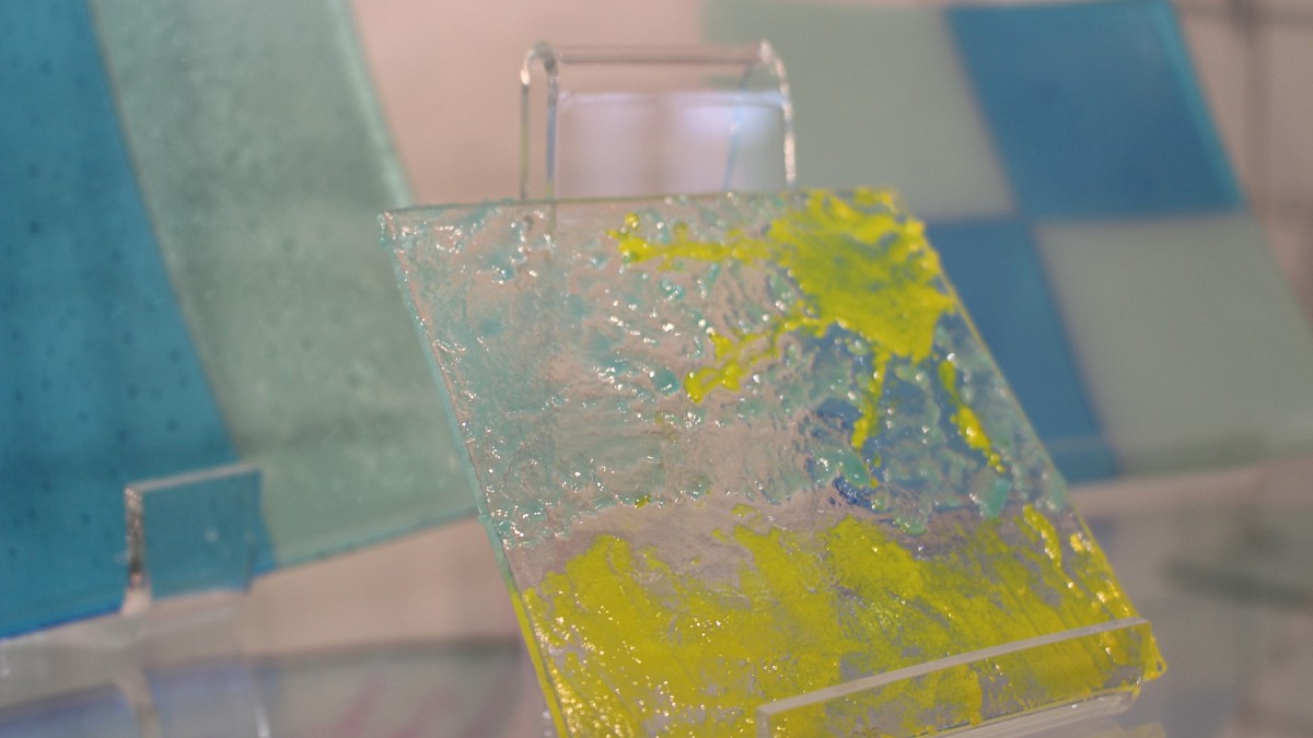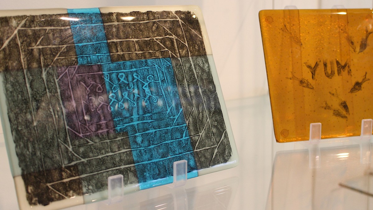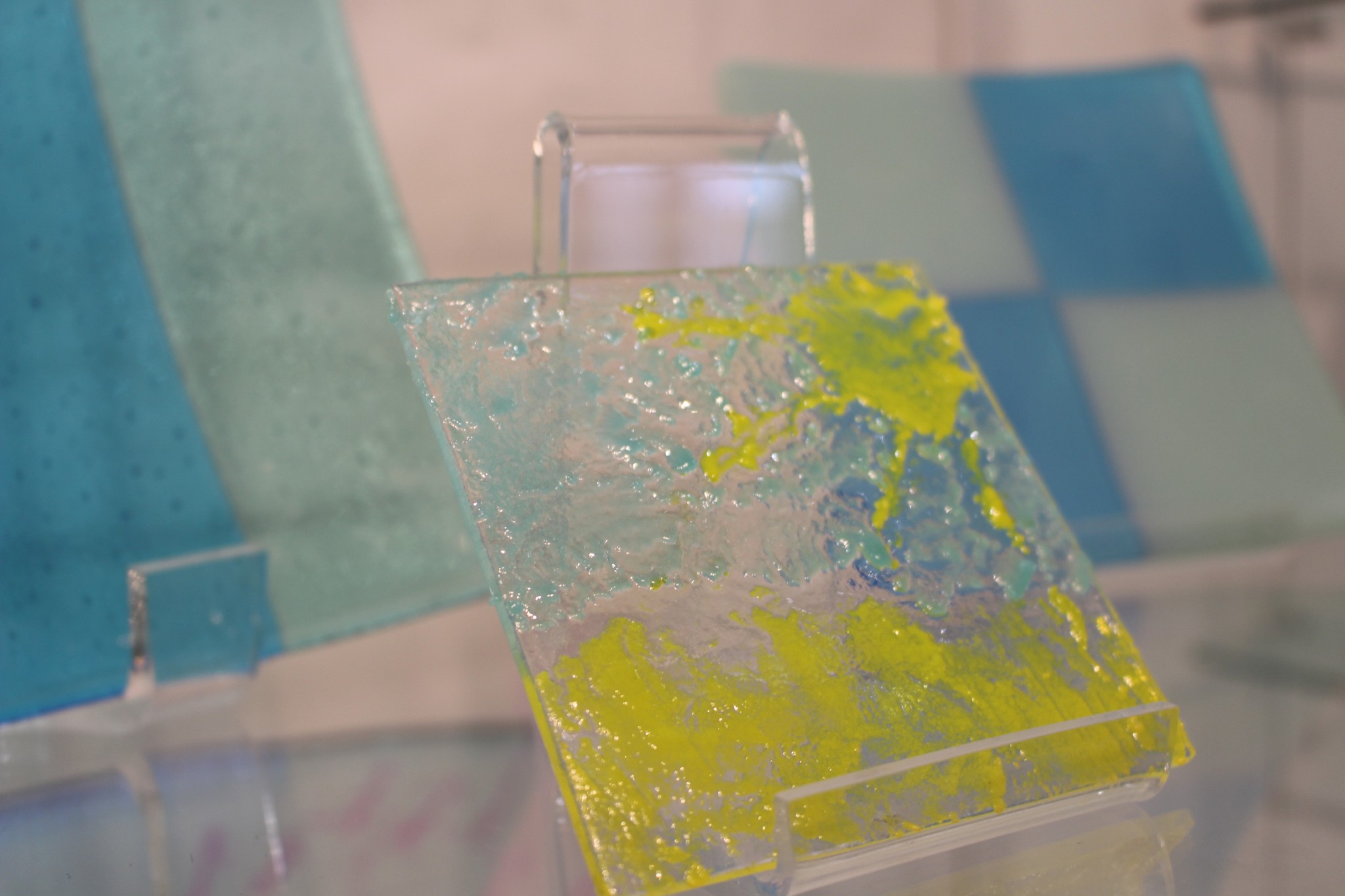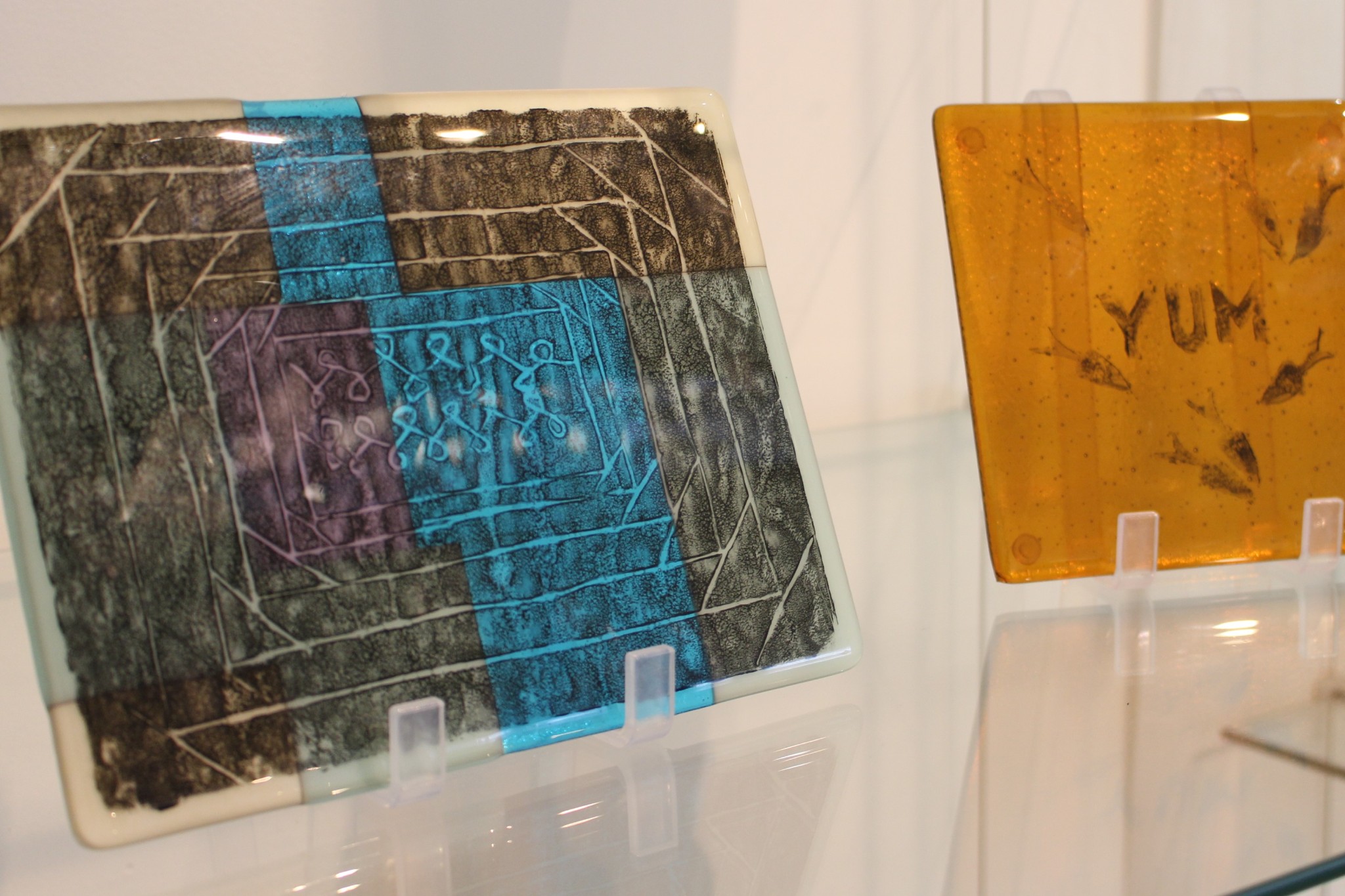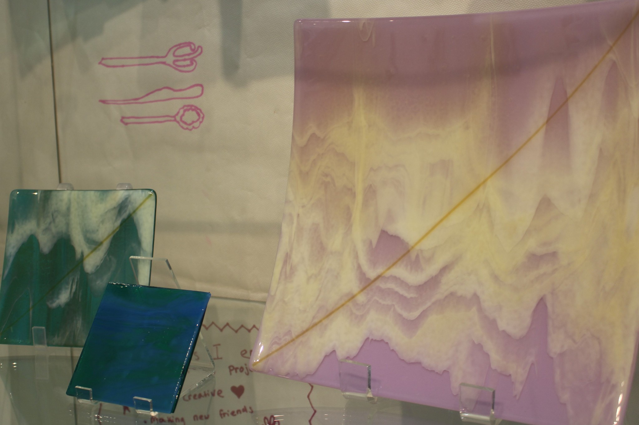 The artworks are an outcome from a series of workshops led by designer Niela Kalra and artist Katie Leask, of Nielanell knitwear in Hoswick. Meeting each week, the group explored glass fusing techniques using Bullseye glass, and were involved in every aspect of designing, cutting and fusing the glass. They experimented with printing and painting onto surfaces and glass slumping. The group also learned about firing the glass in kilns, and the theories behind the programming of the kilns.