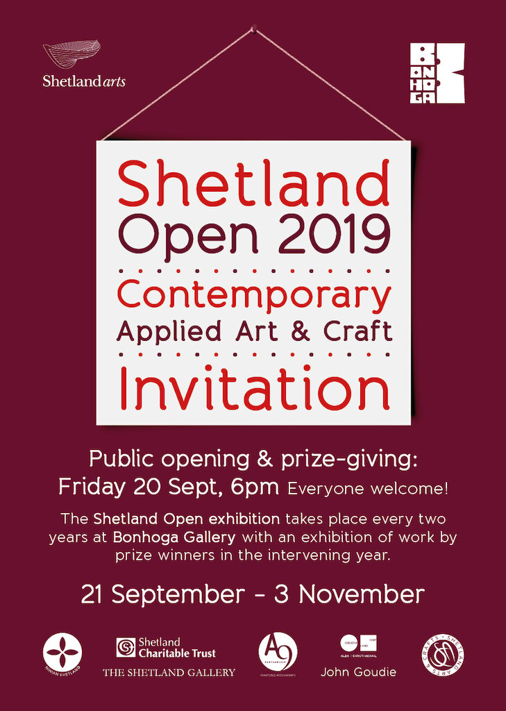 Each sponsored £150 award will be matched by a further £150 from Shetland Arts to fund a group exhibition at Bonhoga in 2020. Our generous sponsors this year are A9 Partnership Ltd, Ninian, John Goudie, Shetland Gallery and Shetland Arts and Crafts Association.