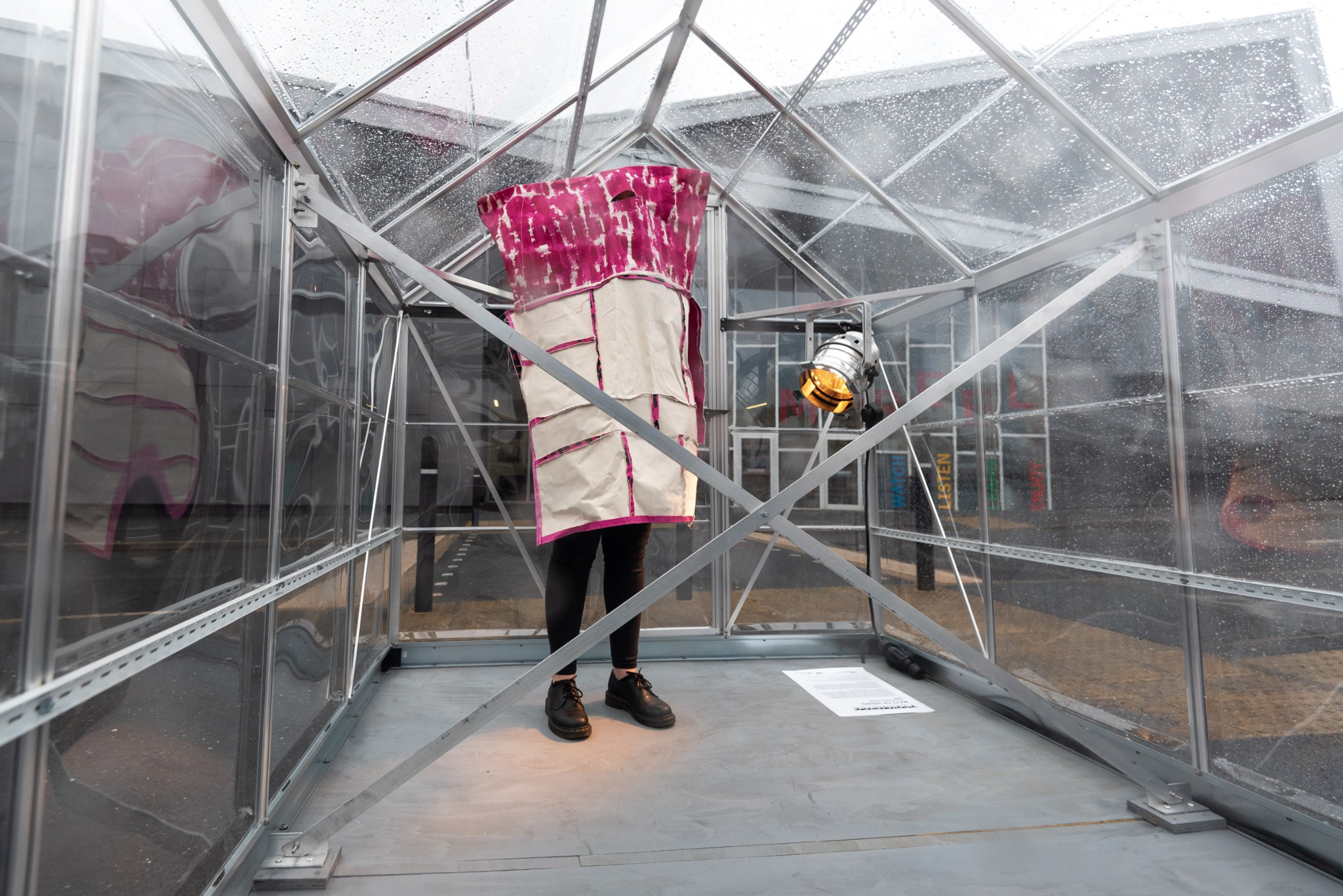 In late 2020, to further tackle questions around the presentation of artwork in our Covid-climate, I occupied an outdoor exhibition space in the form of a glasshouse gallery for Perimeter: Ways of Seeing. I presented a 24hour video stream of my BROADCAST performances and periodically dressed in wearable paintings to inhabit the space alongside the screen. During these performances, I engaged passers-by in silent conversation, using the space itself as a window in as well as a barrier and screen, to contemplate the tensions between absence, presence, and physical and digital forms of communication.