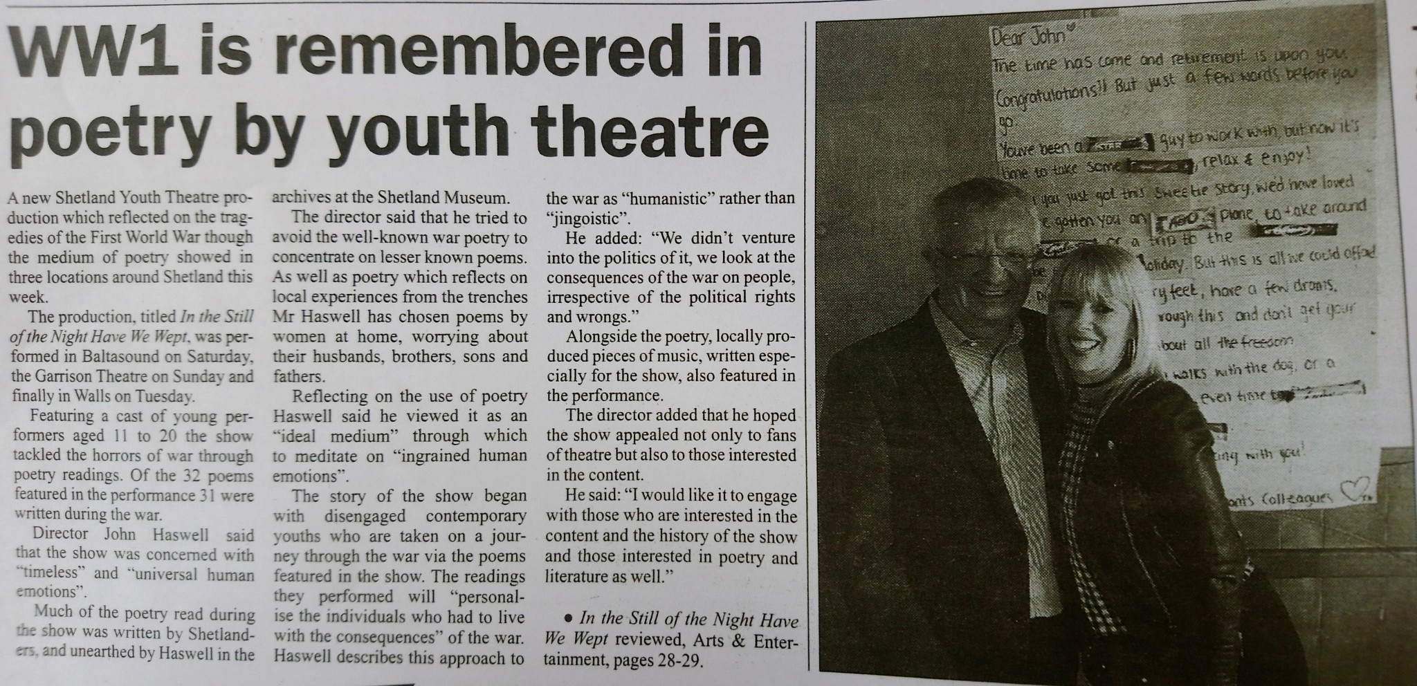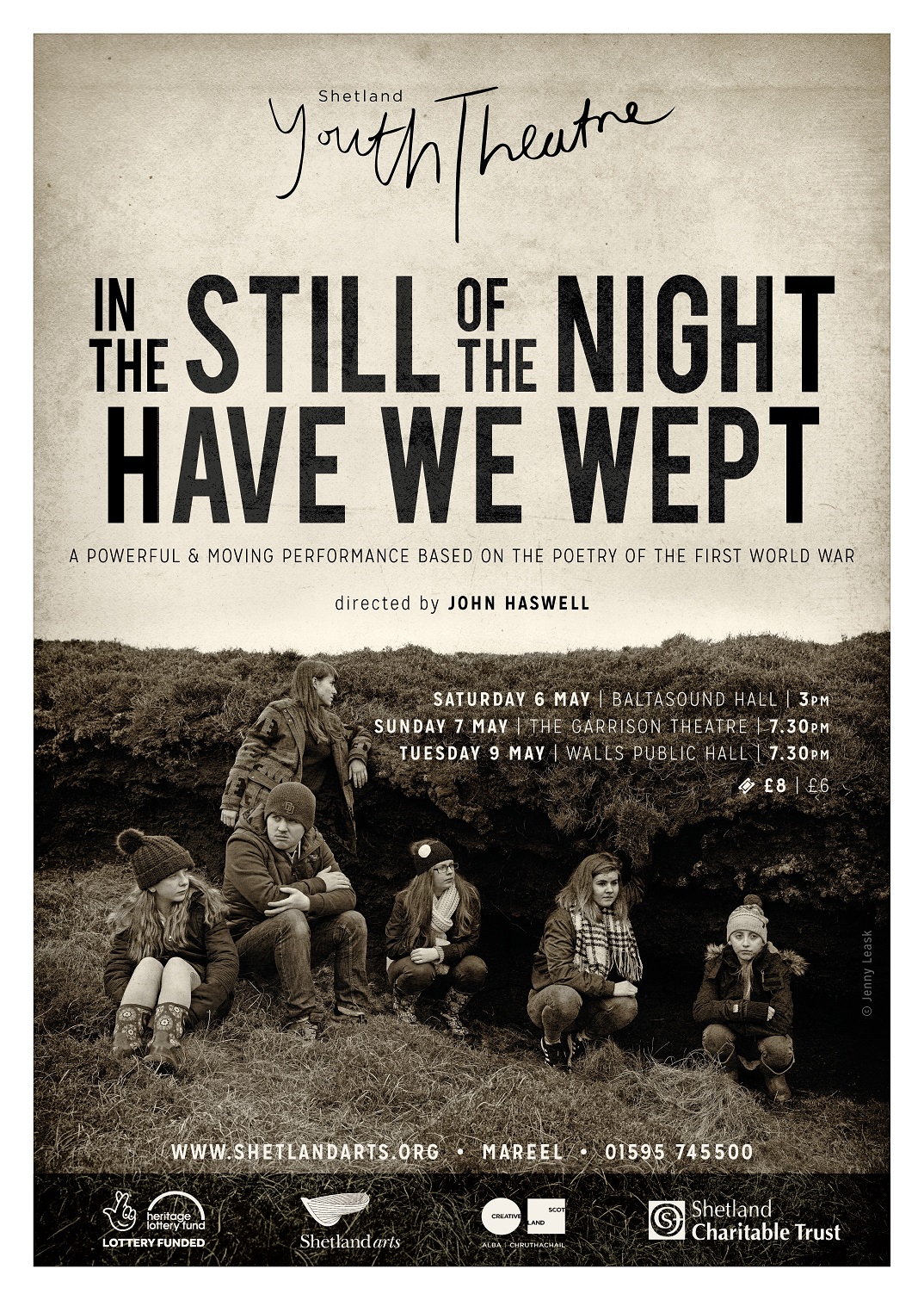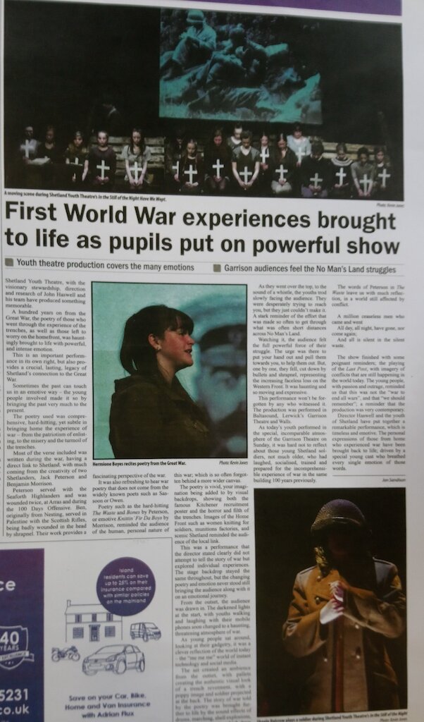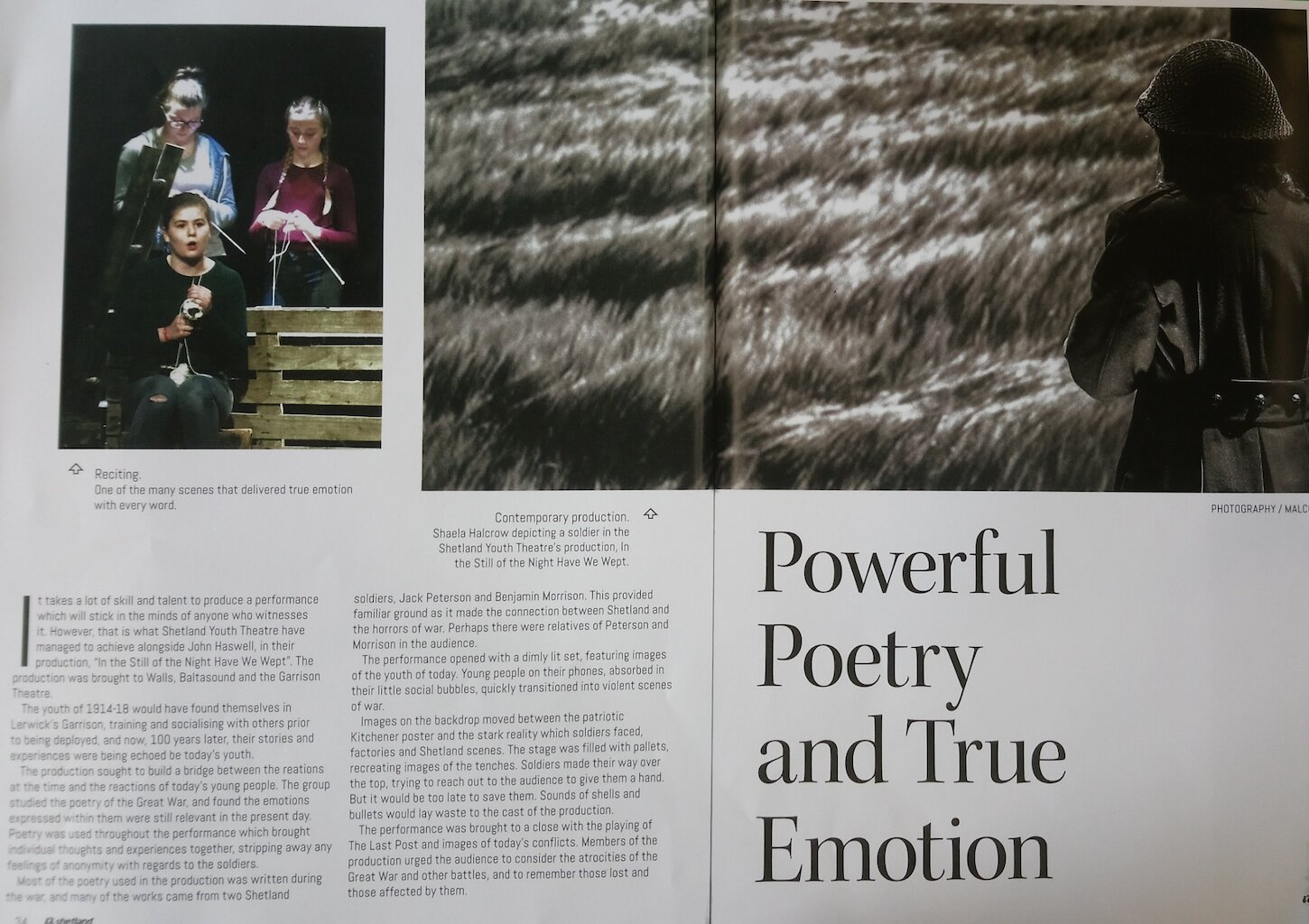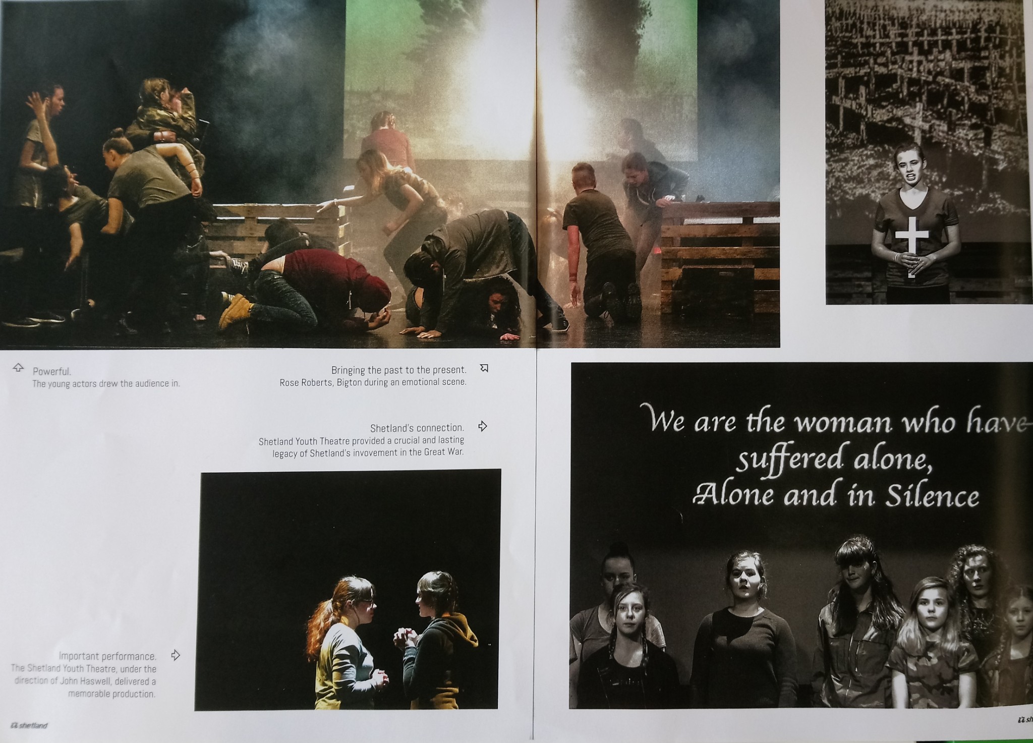The latest Shetland Youth Theatre production was devised by the young people of the Youth Theatre, a contemporary production inspired by the poetry, imagery, documents and artefacts of the First World War. This journey of discovery focused on timeless emotions and emphasise the human stories among the mass carnage of the most cataclysmic war the world had ever experienced. The young people worked with musicians and composers as well as various local organisations such as The Shetland Museum and Archives.